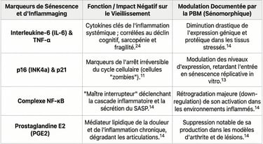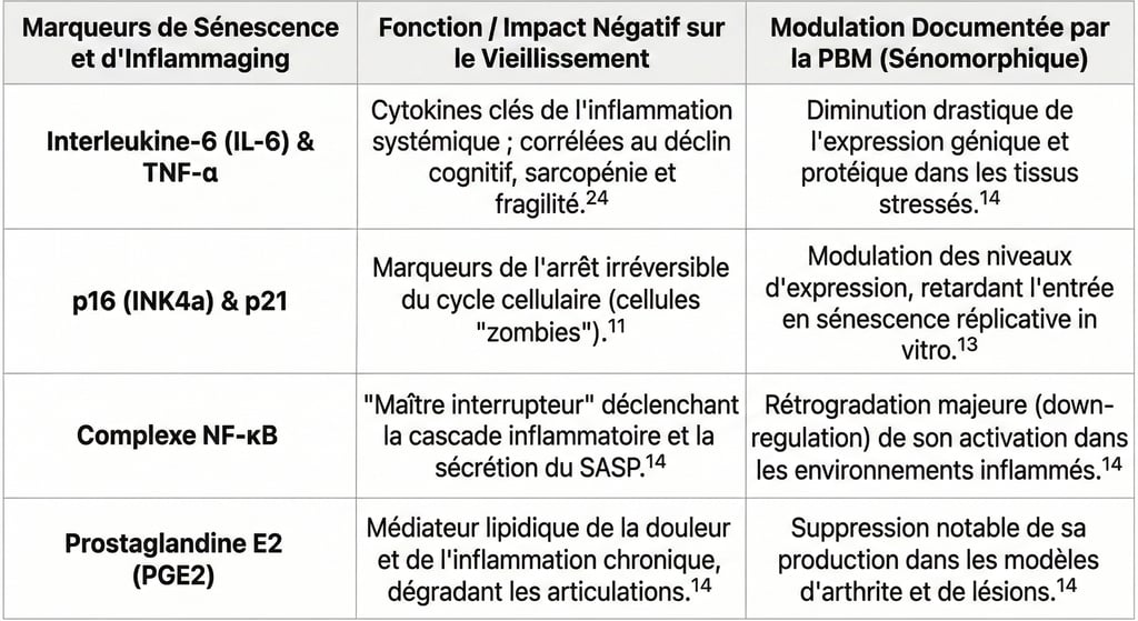 La recherche pharmaceutique moderne tente de créer des "sénolytiques" pour tuer chimiquement ces cellules.26 La photobiomodulation, fidèle à son approche de préservation tissulaire, adopte une stratégie "sénomorphique".26 Sans tuer la cellule sénescente de manière indiscriminée, la lumière modifie le profil de ses sécrétions. En ciblant des marqueurs du cycle cellulaire comme p16, p21 et p53, la PBM parvient à supprimer les composants inflammatoires dévastateurs du SASP tout en conservant intacts les signaux réparateurs indispensables à la régénération, évitant ainsi le risque d'immunosuppression tissulaire souvent associé aux approches destructrices.11