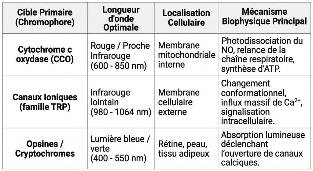 Dans ces registres de fréquences plus profondes, la littérature (indexée sur PubMed et issue de publications comme Oxidative Medicine and Cellular Longevity, 2017) pointe vers l'implication de structures logées directement dans la membrane cellulaire extérieure : les canaux ioniques sensibles à la lumière et à l'infime chaleur métabolique locale.5
