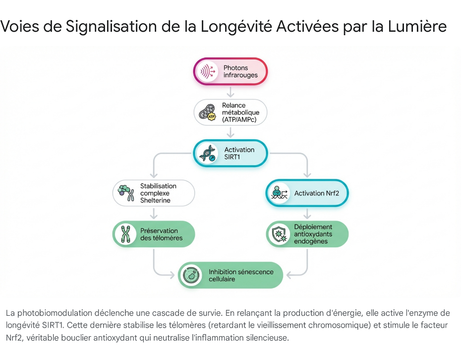 Cette augmentation artificielle de la SIRT1 par la lumière produit des effets de cascade stupéfiants. D'une part, SIRT1 surexprimée stimule directement la voie Nrf2 (le facteur de transcription des défenses antioxydantes décrit plus haut), complétant et renforçant la boucle de protection contre le stress oxydatif.18 D'autre part, la SIRT1 induit elle-même des mécanismes de réparation de l'ADN et favorise l'expression de l'hTERT (le composant catalytique de la télomérase), protégeant physiquement le génome (Dhillon et al., Biol. Reprod.).36