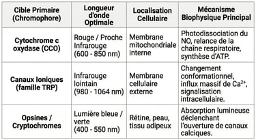 Tableau récapitulatif des principales cibles cellulaires interagissant avec différentes longueurs d'onde lumineuses.