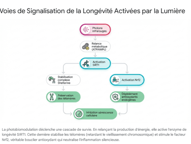 La photobiomodulation agit comme un remède d'exception face à ce déclin. En induisant la cascade AMPc et l'activation de la Protéine Kinase A au niveau des mitochondries, l'exposition à la lumière déclenche une régulation à la hausse massive de l'activité de l'enzyme SIRT1.16