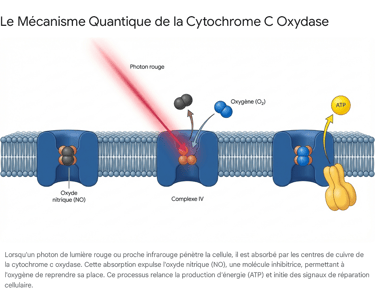 L'architecture moléculaire de la CCO est fascinante. Elle contient plusieurs centres métalliques, notamment des atomes de cuivre (CuA et CuB) et de fer héminique (hème a et hème a3).9 Les nuages électroniques de ces centres métalliques sont biophysiquement "accordés" pour absorber l'énergie des photons rouges et proches infrarouges (Hamblin, 2018, Photochemistry and Photobiology).11 Lorsqu'un photon frappe ces centres métalliques, son énergie est absorbée et entraîne une excitation électronique locale, modifiant l'état d'oxydoréduction de l'enzyme et déclenchant un changement conformationnel de sa structure tridimensionnelle.10