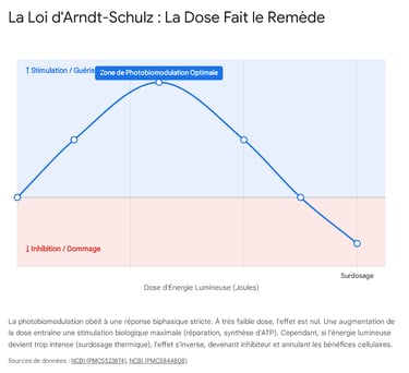 Ce dialogue complexe avec les ROS explique la loi d'airain qui régit la photobiomodulation : la courbe de réponse biphasique (ou Loi d'Arndt-Schulz).16 Cette loi stipule que les effets biologiques de la lumière ne sont pas linéaires, mais obéissent à une courbe en forme de cloche (ou en "U" inversé).